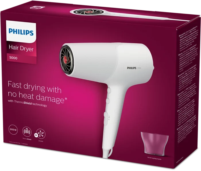 Sušilo za kosu BHD500/00 omogućuje brzo i sigurno sušenje. To je malo i snažno sušilo koje pruža profesionalne rezultate sa snagom od 2100 W i štiti vašu kosu od oštećenja toplinom pomoću ThermoShield tehnologije. Možete birati između 6 kombinacija brzina i topline.